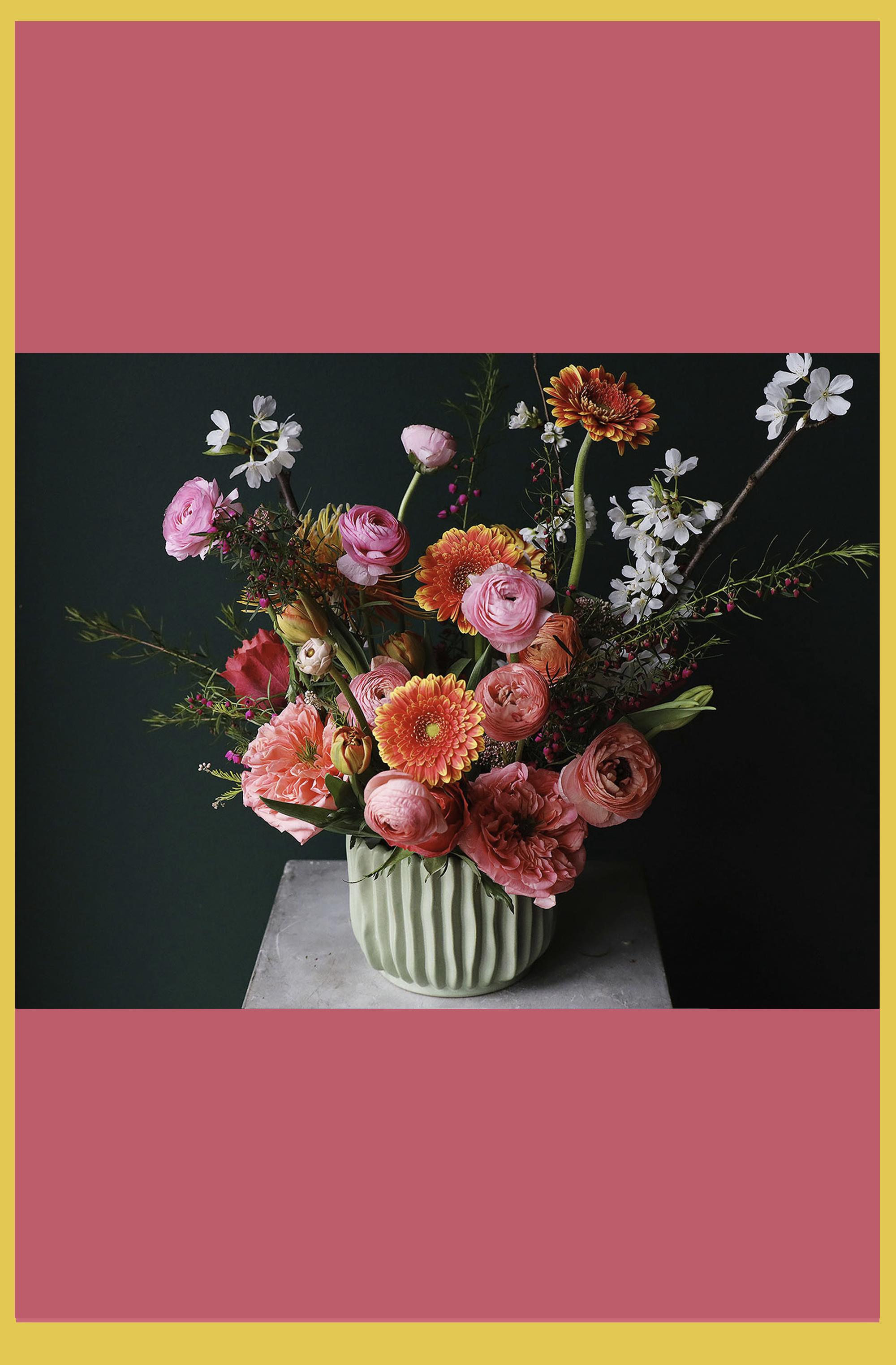 Ranunculus · Garden Roses · Gerbera Daisies · Tulips · Cherry Blossom Branches · Waxflower · Seasonal Greenery