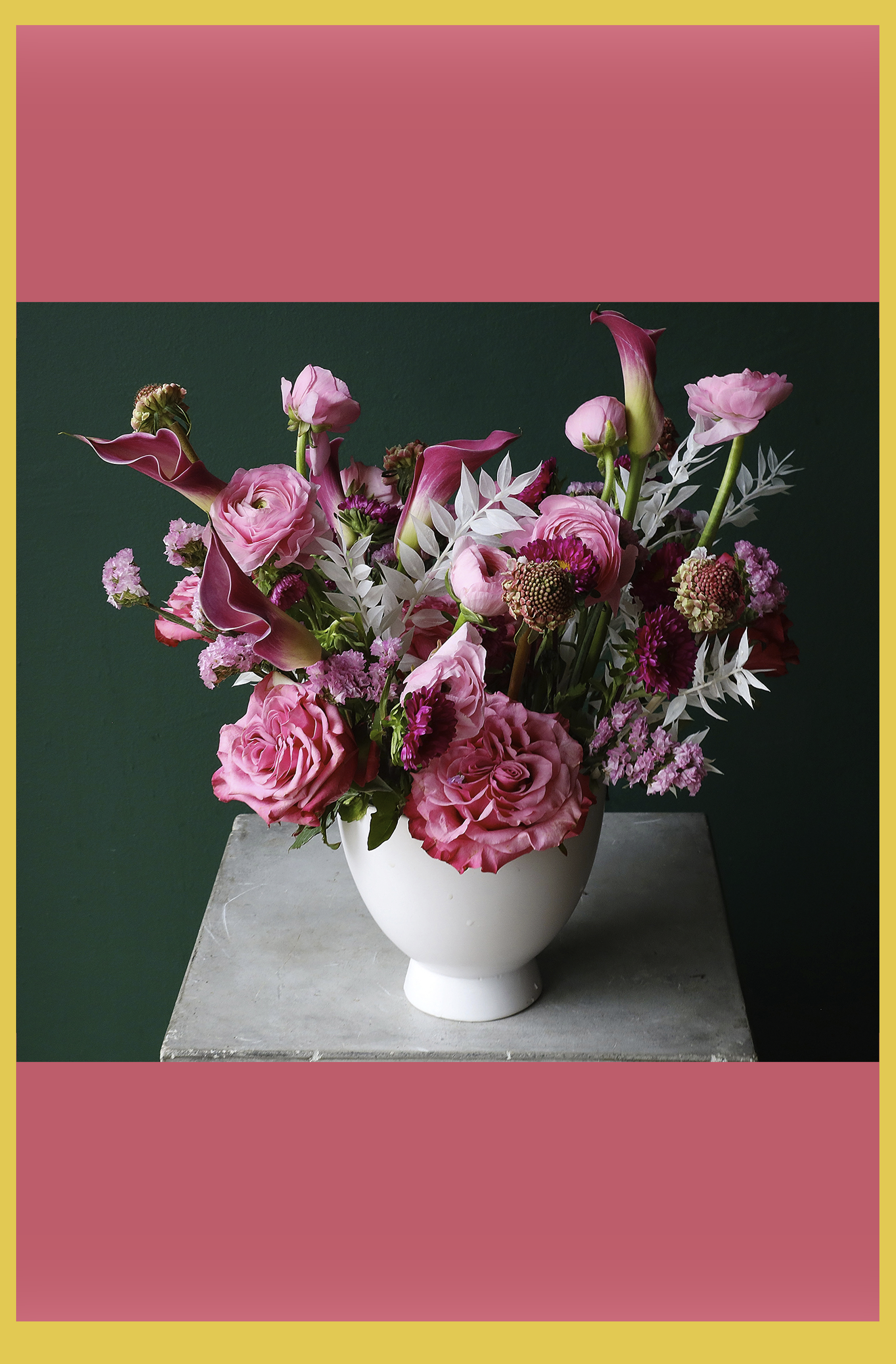 My Fuzzy Pink Lady is a sculptural floral composition defined by lush pink roses, graceful calla lilies, and layered seasonal blooms. Soft blush and coral tones are balanced with subtle lavender accents and fresh greenery, creating depth, movement, and a quietly romantic presence. Handcrafted with intention, this arrangement feels refined, expressive, and effortlessly elegant.